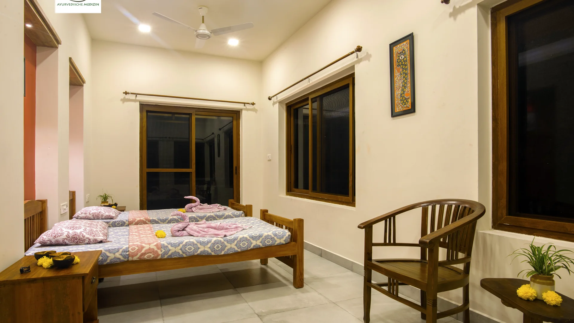 Die Zentren verfügen jeweils über 10 Zimmer, was uns hilft, unseren Gästen die beste persönliche Betreuung zu bieten, und wir garantieren Ihnen, dass es sich lohnt. Die Aussicht von jedem Cottage/Zimmer ist wohltuend für die Augen und reduziert Stress durch eine ruhige und schadstofffreie Umgebung. Die Ruhe des Ortes ist perfekt für Ayurveda, Yoga und Meditation. Das Ayurveda-Zentrum liegt nur 55 km – 1 Stunde 30 Minuten Fahrt vom internationalen Flughafen Cochin entfernt. Kommen Sie und erleben Sie mit uns die überirdische Ruhe und Gelassenheit.