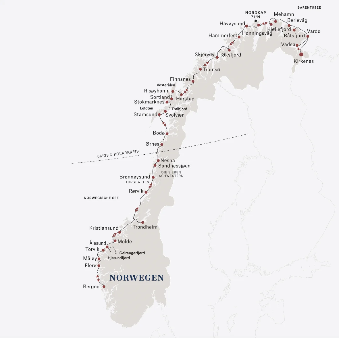 Unsere klassische Rundreise entlang der gesamten norwegischen Küste – vielfach als „Die schönste Seereise der Welt“ bezeichnet. Die Reise, mit der alles begann. Auf 2.500 Seemeilen laufen Sie 34 Häfen jeweils zweimal an und erleben in zwölf faszinierenden Tagen Norwegens Naturwunder und Küstenorte.