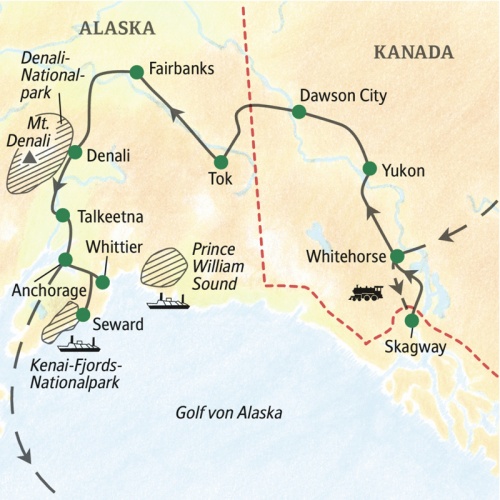Tausende von Gletschern, der höchste Berg Nordamerikas und tief eingeschnittene, glitzernde Fjorde: Schon die ersten Siedler, russische Händler, waren fasziniert von Alaska. Diese Studiosus-Reise führt uns vom kanadischen Yukon durch die Weite des Nordens nach Dawson City, über den Top of the World Highway ins Herz Alaskas. Dann warten der Denali und die blauen Fjorde des Prince William Sound mit ihrer Eisgipfelkulisse. Staunen Sie über die blühende Vielfalt der Flora und die Tierwelt zwischen Tundra und Pazifik. Alaskas Wildnis und seine grandiosen Panoramen rauben Naturliebhabern den Atem!