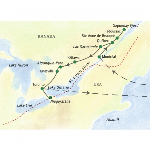 Ob Whale-Watching im St.-Lorenz-Strom, kleine Wanderungen in Naturparks oder eine Spritztour an den Niagarafällen – diese Reise durch Kanadas Osten ist auch im Sommer gespickt mit Naturerlebnissen. Zu den Terminen im Herbst entfaltet zusätzlich der Indian Summer seine gewaltige Farbenpracht, wenn Ahorn, Eichen und Espen in allen Rottönen leuchten. Sie begegnen außerdem der Kultur der indigenen Völker, den First Nations, genießen Kanada im Ohr und auf der Zunge und erleben eine lässige Multikulti-Szene in Ostkanadas Metropolen – mal geprägt vom britischen Lifestyle, mal vom französischen Savoir-vivre. Und auch für eigene Erlebnisse bleibt auf dieser gemütlichen Runde genügend Zeit.