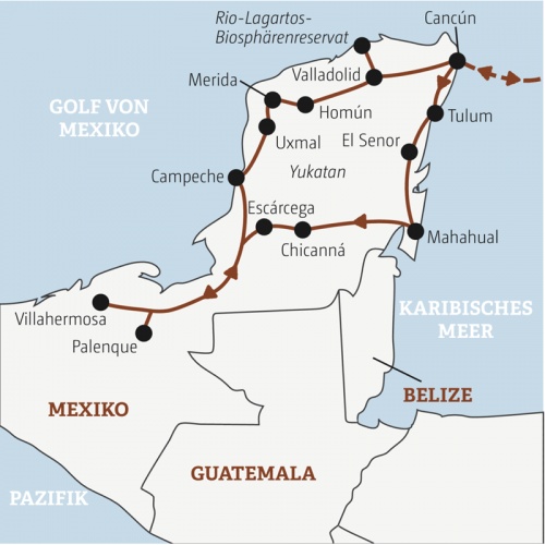 Vom Urwald verschlungene Städte, in den Baumwipfeln turnen die Brüllaffen. Wir erklimmen uralte Mayabauten, wischen uns oben den Schweiß von der Stirn und genießen den Blick in die Weite. Wir mixen uns einen Cocktail aus Stränden, bezaubernden Kolonialstädten und tropischer Tierwelt. Dazu eine schokoladige Verführung, feurige Snacks und tiefblaue Cenotes. Abenteuerinstinkt geweckt? Vamos!