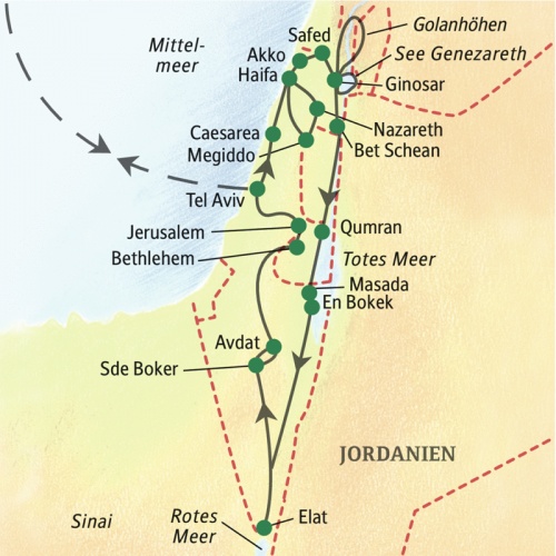 Das Land der Bibel: Religion begegnet uns in Israel auf Schritt und Tritt. Aber das kleine Land hat auch andere Gesichter: lässiges Szeneleben in Tel Aviv zum Beispiel und jede Menge Landschaftszauber. Zwischen den grünen Hügeln Galiläas und der Wüste Negev, zwischen Totem Meer – dem tiefsten Punkt der Erde – und den Korallenriffen am Roten Meer sind wir immer mal wieder auch zu Fuß unterwegs. In Bethlehem lernen wir in einer Familie die palästinensische Perspektive des Nahostkonflikts kennen, auf einem Weingut testen wir edle Tropfen made in Israel. Und bei einer Auszeit am Strand können Sie auf unserer ausführlichsten Israelreise zwischendurch die Eindrücke Revue passieren lassen.