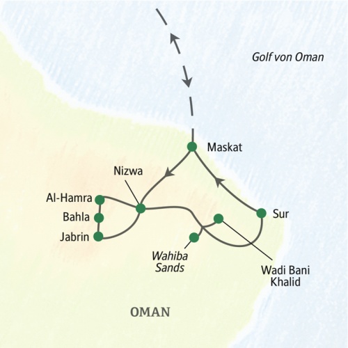 Weihrauch, Myrrhe und Muskat – bezaubernde Düfte weben ebenso an der Aura des Orients wie die märchenhafte Architektur. Welche Aromen erwarten uns im Souk von Muttrah? Und warum duften sogar die Menschen im Oman ganz besonders betörend? Stecken Sie auf dieser Reise durch das omanische Reich Ihre Nase auch in Burgen aus Lehm und Wadis voller Palmen, in opulente Märkte und in eine traditionelle Dhauwerft. Schon möglich, dass Ihnen beim Prunk der Moschee in Maskat der Atem stockt. Im Wüstencamp in den Wahiba Sands können Sie dann unter Sternen träumen. Alles übrigens zu erfreulichen Preisen, denn wir verzichten auf den Luxus der Scheichs.