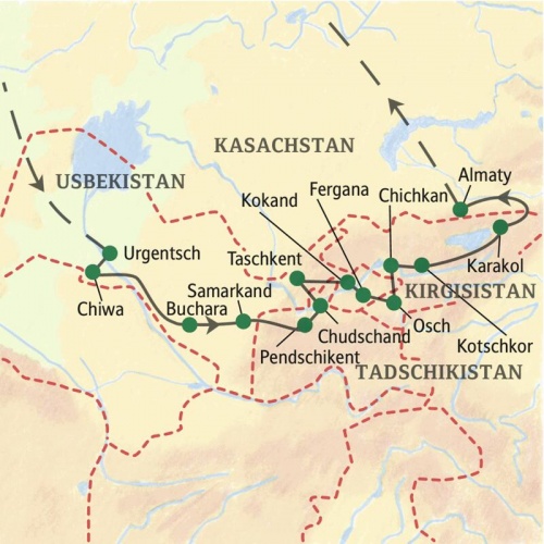 Zu feinstem buntem Tuch verwoben sind bei dieser intensiven Rundreise entlang der legendären Seidenstraße die Highlights der vier Länder Usbekistan, Tadschikistan, Kirgisistan und Kasachstan. Aquamarin steuern die Kuppeln von Samarkand bei, Grün das kosmopolitische Almaty, Türkisblau und Schwarz die sieben Seen Haft Kul, Rot und Gelb der Sandstein der Märchenschlucht, und einen strahlenden Grundton legt über alles die Herzlichkeit der Menschen, denen wir begegnen. Wir widmen uns intensiv den usbekischen Oasenstädten Samarkand und Buchara und den archäologischen Schätzen von Tadschikistan, lassen uns aber auch von unglaublichen Landschaften faszinieren: weite Steppen, wildromantische Täler, gewaltige Schluchten, stahlblaue Bäche, schroffe Felsen, glitzernde Seen.