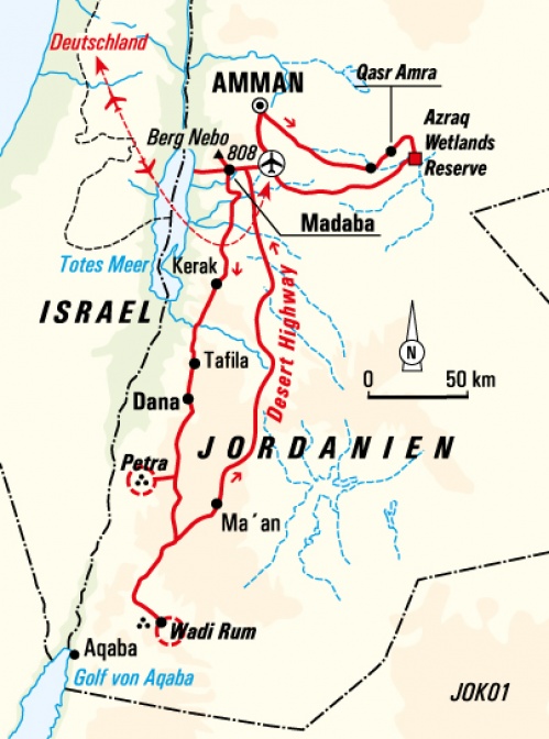 Diese Reise zeigt ihnen die Höhepunkte Jordaniens von Norden bis Süden. Gewandert wird zwischen 3 und 6 Stunden am Tag. Um diese Tagesetappen genießen zu können, sollten Sie entsprechend Kondition, Ausdauer sowie gute Trittsicherheit mitbringen (d.h. sicheres Gehen auf unterschiedlich beschaffenem bzw. erdigem, felsigem und sandigem Gelände). Für die Wanderungen benötigen Sie einen Tagesrucksack, in dem Sie das Notwendigste wie Trinkwasserflasche, Sonnenschutz, Fotoapparat usw. selbst tragen. Als Gehhilfe haben sich Teleskop-Tourenstöcke bewährt. Große Temperaturunterschiede zwischen Tag und Nacht kennzeichnen das Wüstenklima. Vor allem im Wadi Rum kann die Hitze die Wanderungen erschweren und dem Kreislauf zu schaffen machen. Gesundheit und Kondition sind daher wichtig; lassen Sie bitte vor Reiseantritt Herz und Kreislauf von Ihrem Arzt oder Ihrer Ärztin prüfen. In Jordanien sind die Entfernungen nicht allzu groß und die Straßen auf den Hauptstrecken in recht gutem Zustand. Die Überlandfahrten sind daher nicht zu anstrengend.