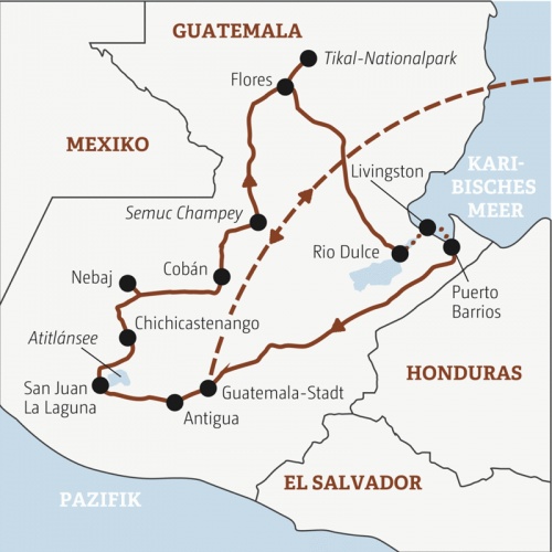 Willkommen im Land der Bäume! Und neben Dschungel-, Plantagen- und Weidengrün kann Guatemala auch Kunterbunt: Mayatrachten und -traditionen in allen Farben, Karibikblau und Feuerberggrau. Wir pendeln von Küste zu Küste, zwischen wilder Natur und indigener Kultur, Hochland und Unterwelt. Wir steigen den Tempeln von Tikal aufs Dach und kraxeln auf den Vulkan Pacaya, erobern den Regenwald und bei Familienbesuchen die Herzen der Einheimischen, legen Wander-, Markt- und Strandtage ein. Zwei Wochen per Boot und Bus, Jeep und zu Fuß. Für Abenteurer fast ein Muss!