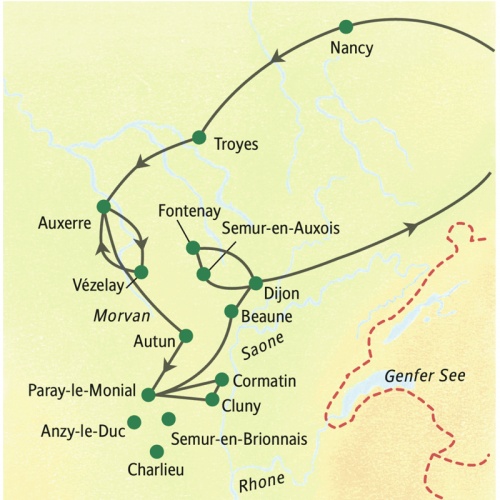 Willkommen zu unserer kleinen Landpartie durch eine uralte Kulturlandschaft voller Charme, gepflastert mit Glanzlichtern romanischer Kunst! Die burgundischen Kirchen und Klöster, geistige Zentren des Mittelalters, haben auch heute noch reichlich Strahlkraft. Mit verschlafenen Dörfern, die in der Sonne vor sich hinträumen, sanft rollenden Hügeln und Weinbergen, auf denen edle Tropfen reifen, vereinen sie sich zu einem Stück Bilderbuch-Frankreich. Wir reisen zurück durch die Jahrhunderte, genießen aber auch die Vorzüge der Gegenwart: Wir wohnen in angenehmen Hotels und erhaschen beim Picknick, in einer Senfmanufaktur, auf dem Markt und beim Besuch auf einem Weingut einen Eindruck der französischen Lebenskunst.