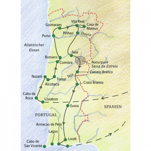 Bühne frei für Portugal! Auf dieser Studiosus-Reise bleiben Sie aber nicht auf Ihrem Platz sitzen, sondern entdecken Schritt für Schritt, Szene für Szene die Vielfalt des Landes: Kulissen wie Weinterrassen, Gletschertäler, Korkeichenwälder und Steilküsten. Schauplätze wie das Zisterzienserkloster von Alcobaca, die Christusritterburg von Tomar und die Barockbibliothek von Coimbra. Akteure wie Könige, Tempelritter, Fado-Sänger und Studenten in schwarzen Umhängen. Freuen Sie sich auf eine Wanderreise von Lissabon über Porto ins Landesinnere bis ans Ende Europas!