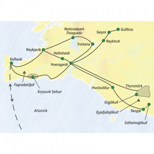 Wen im Thermalgebiet Krysuvik Seltun der Geruch nach faulen Eiern stört, kann sich ja eine Wäscheklammer auf die Nase klemmen. Dafür entdecken wir blubbernde Erdlöcher und zischende Vulkangasspalten! Ihr habt noch nicht genug von Vulkanen? Vielleicht lässt es der Fagradalsfjall heute zu, dass wir ihn auf einer Wanderung erkunden? Wenn nicht, entscheiden wir ganz spontan, wie wir den heutigen Nachmittag verbringen. Unser Reiseleiter hat viele Ideen. Anschließend Fahrt nach Keflavik und Übernachtung dort. 130 km. Beim Abendessen und einem Abschiedsquiz in einem landestypischen Restaurant erinnern wir uns an unseren spannenden Familienurlaub, den wir in Island erlebt haben.